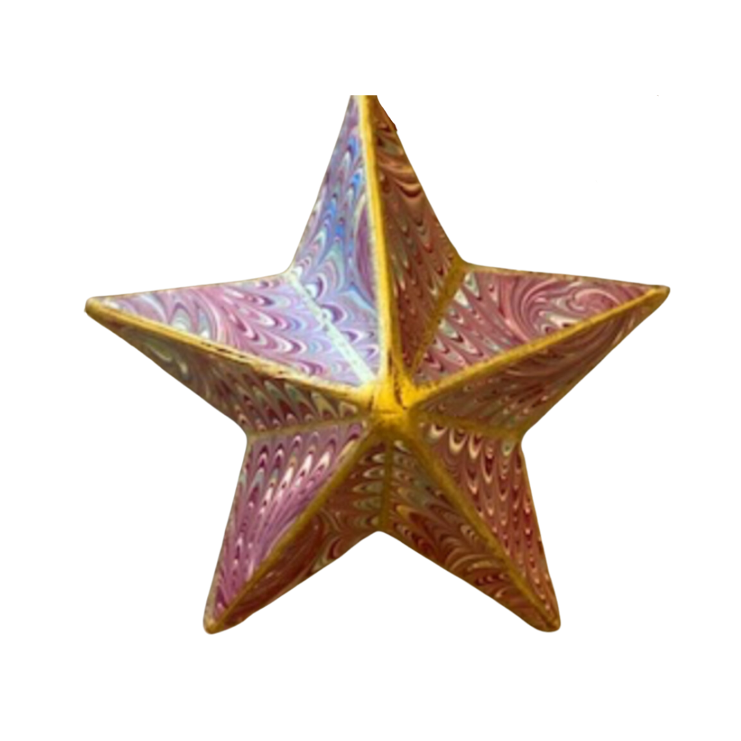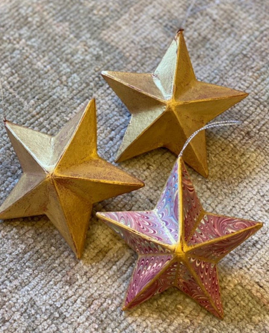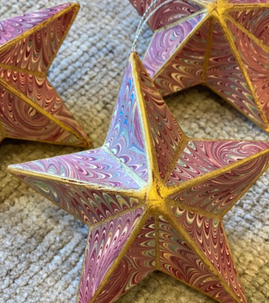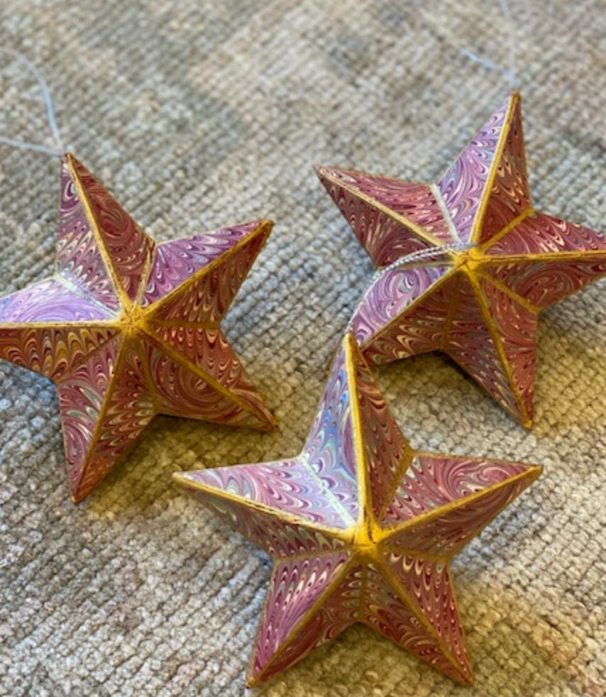 Created by Emily Vanderputten these ornaments are hand marbled paper with a gold background. They make a fabulous addition to a Christmas tree OR use them as party favor at each guests seat!
