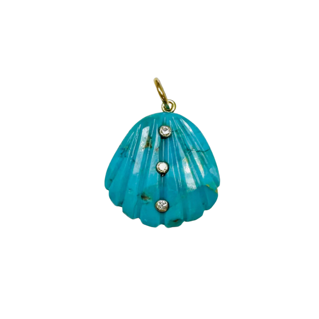 carved shell with three bezel set diamonds, 1 inch in length without bail