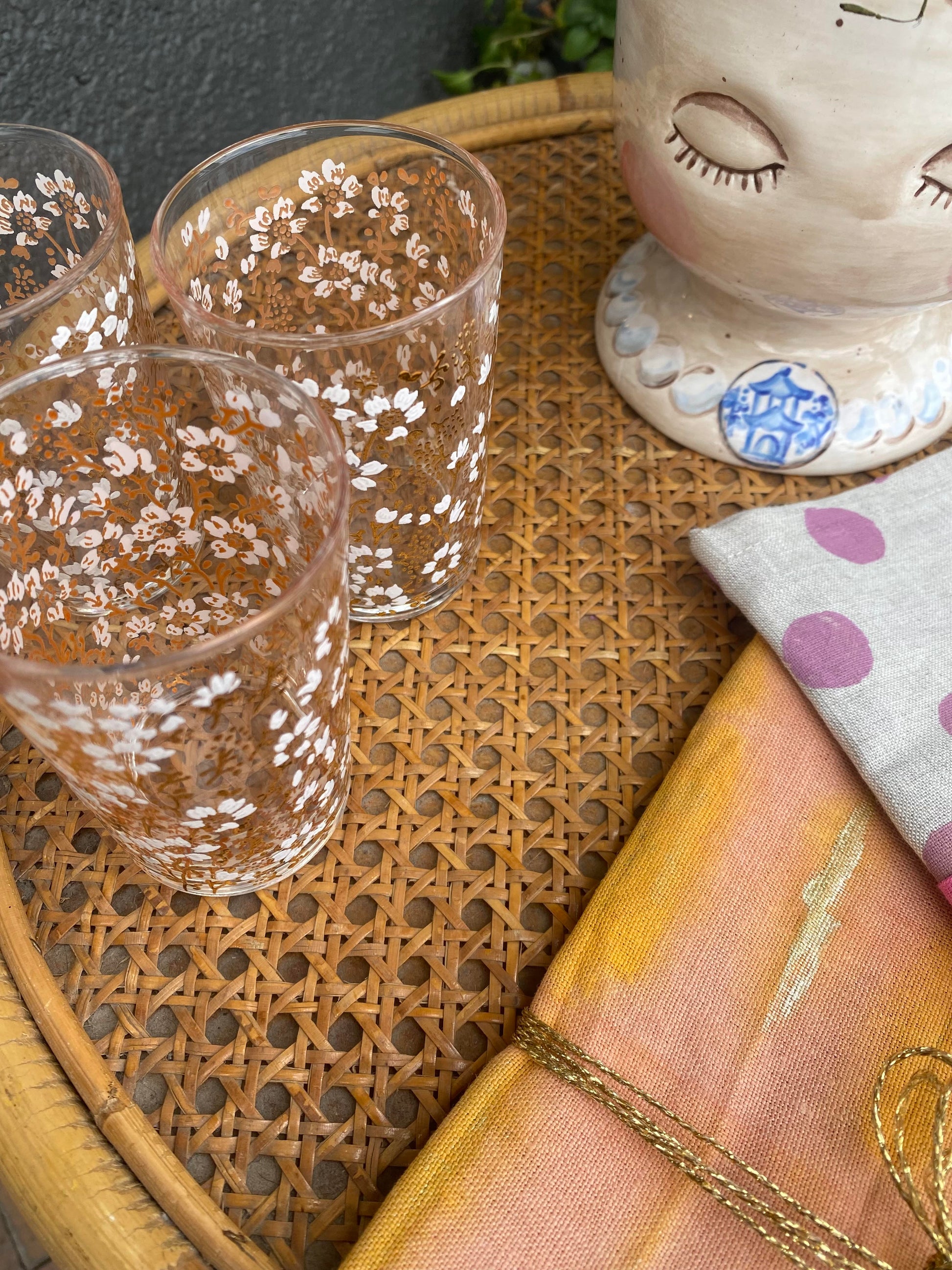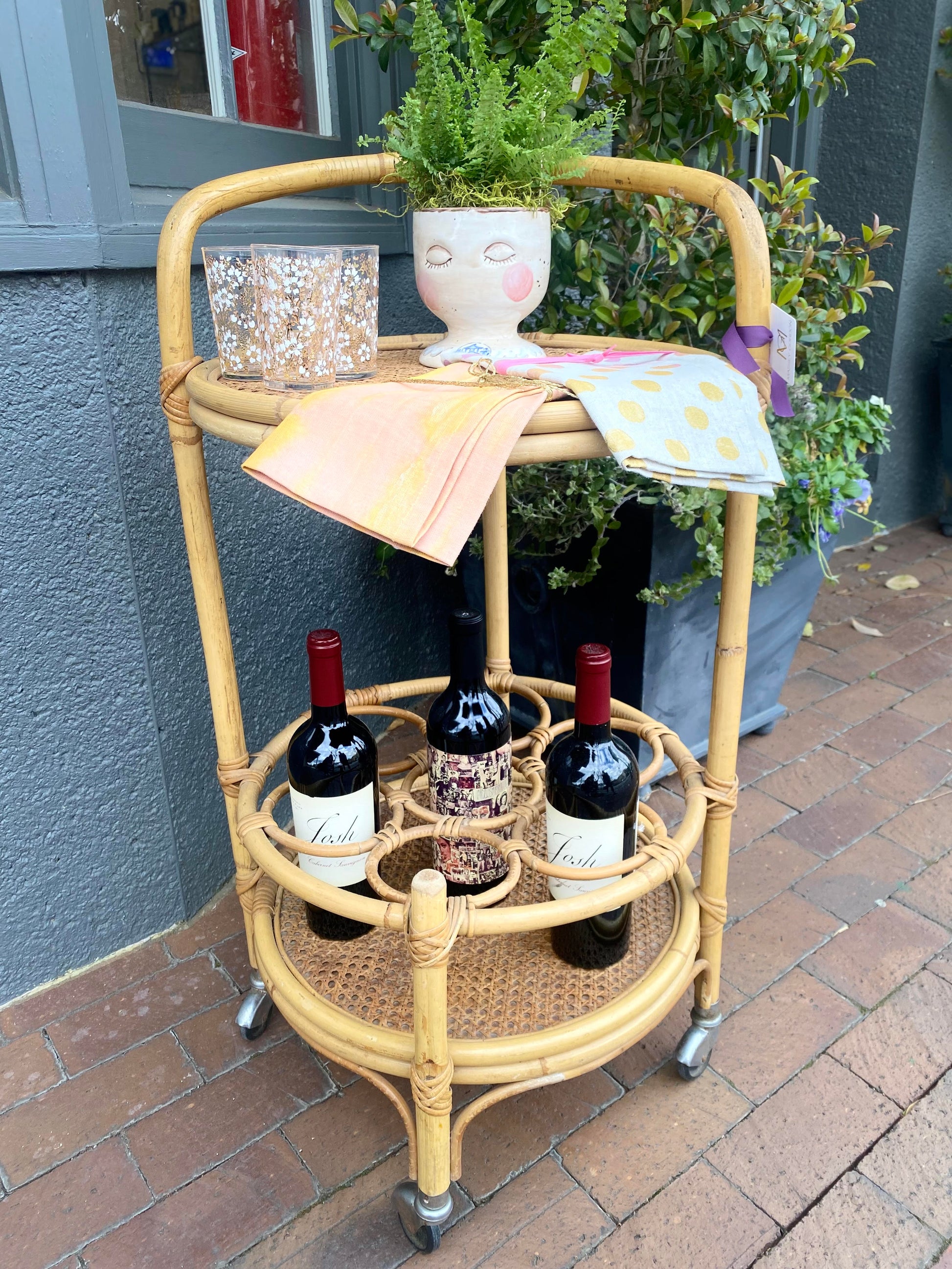 Vintage Serving Bar Cart table with natural rattan wicker, with wheels.