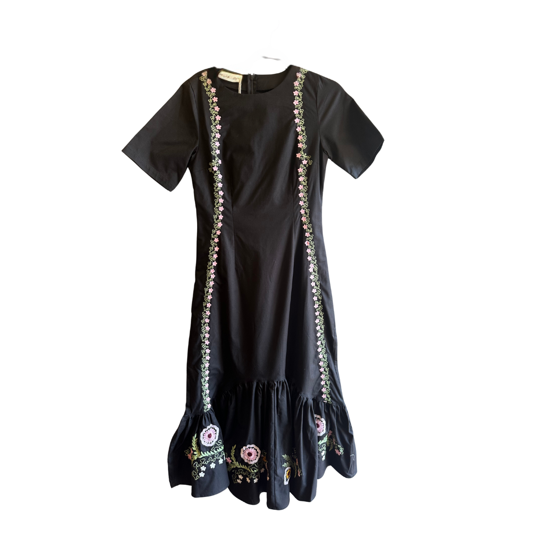 This Dress flaunts a tulip flounce skirt with intricate floral embroidery, imparting a stunningly elegant aura.