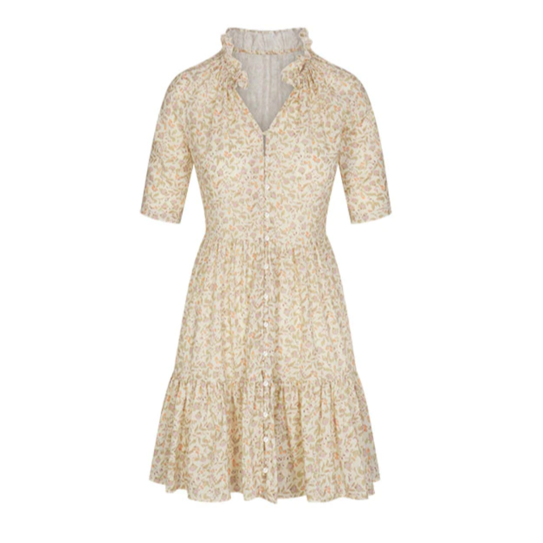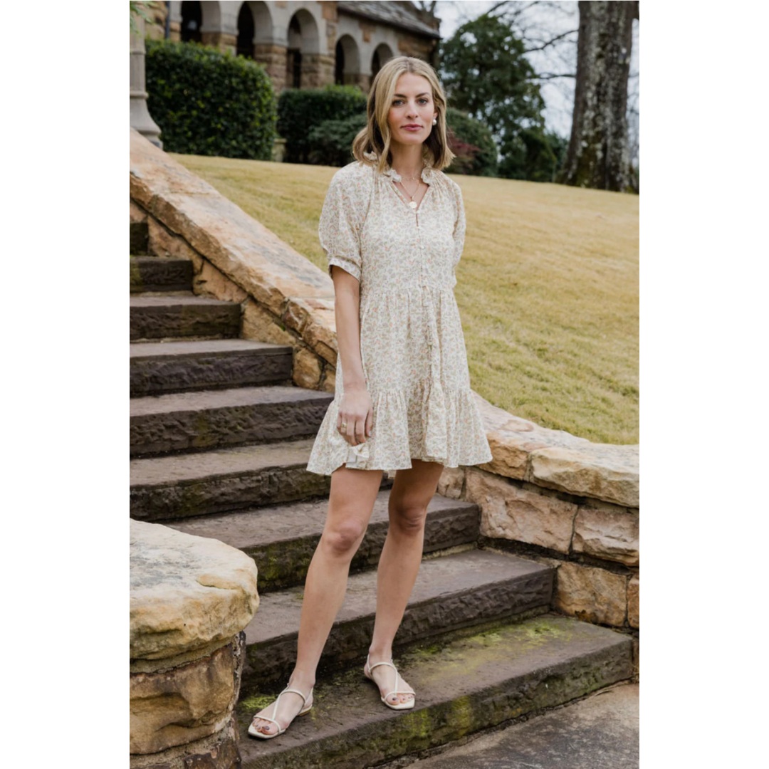 Soft and flowing, short and delicate, this dress is easy and flattering in a way that is perfect for warmer months ahead. Made of a super light white, printed cotton the Ella Dress features details such as a tiered silhouette and fabric covered buttons. The included slip allows this dress to be a no brainer for getting ready.
