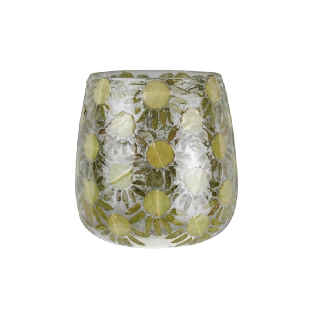 Earthen materials sourced from nature are forever conserved in this enameled hurricane. Green leaves are arranged into a fun pattern and enameled onto simple glass silhouettes presenting a large scale garden luminary.