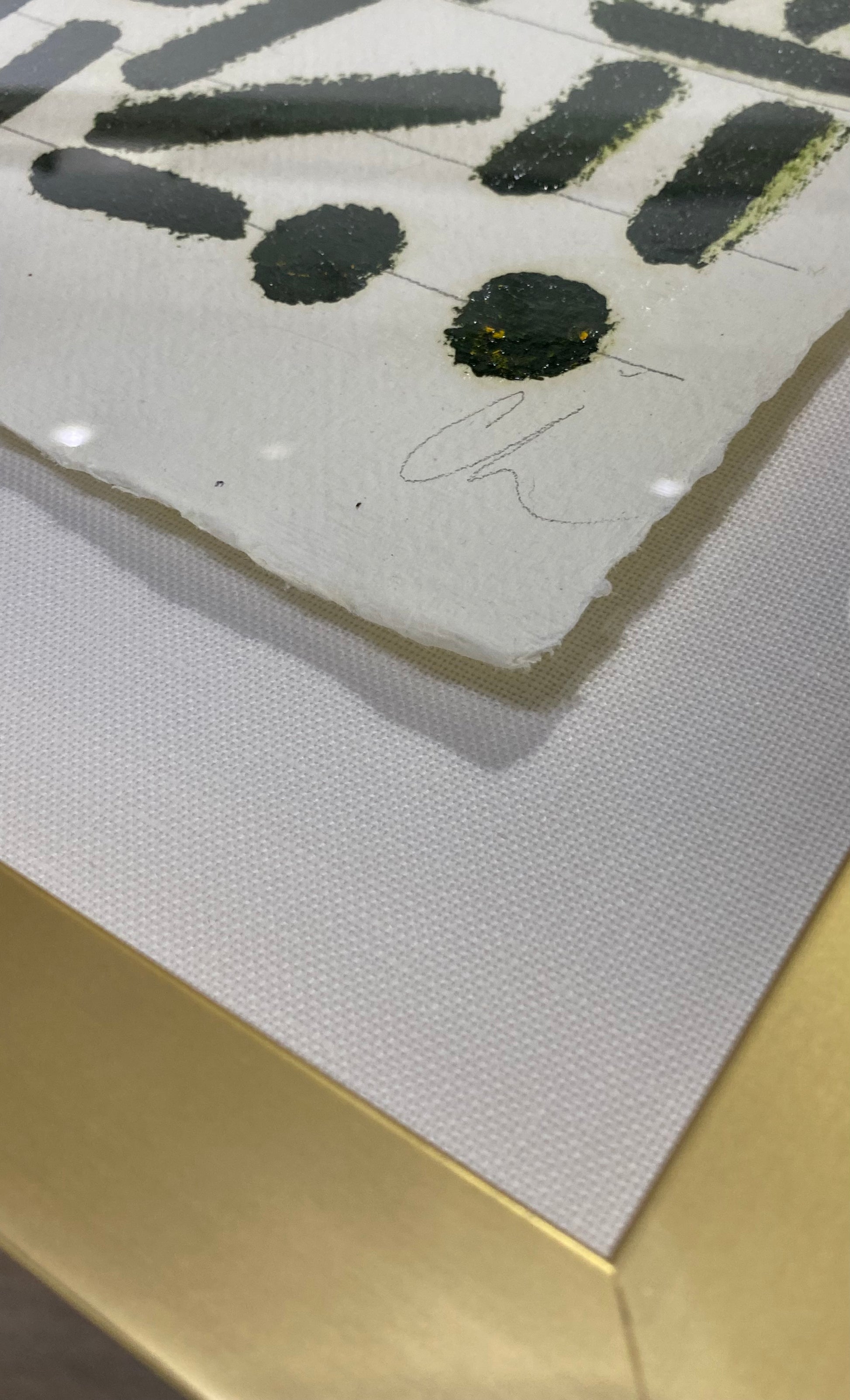 18x23, (dark ink green) oil on beveled cotton rag paper, custom framed floating with linen + gold frame