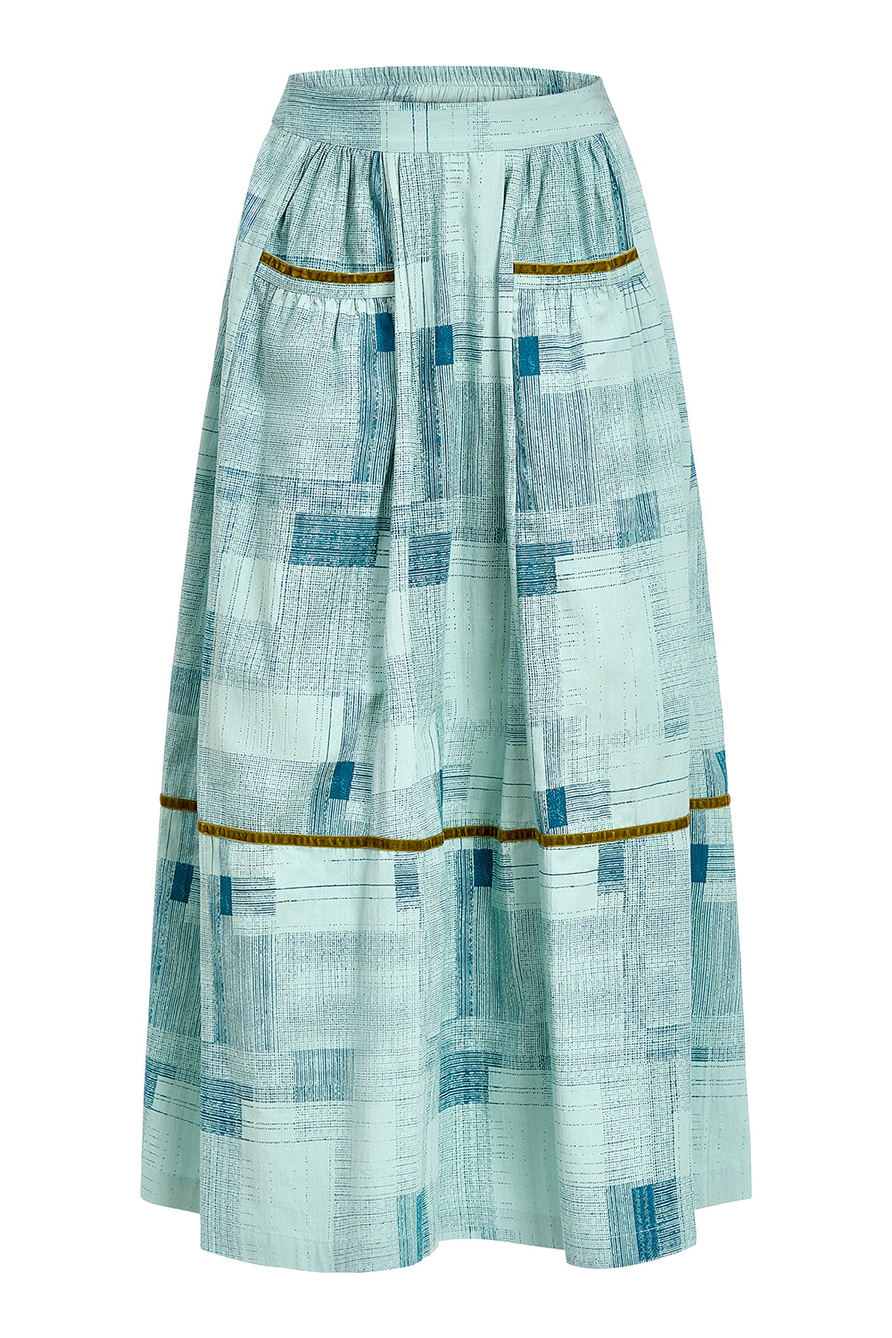 The Gabby Skirt features a flattering midi length with practical front pockets. Its unique design combines a structured set waistband at the front with an elastic waistband at the back, ensuring both a polished look and comfortable fit. The blue print pattern adds a fun textured look, making this skirt a stylish addition to any wardrobe.