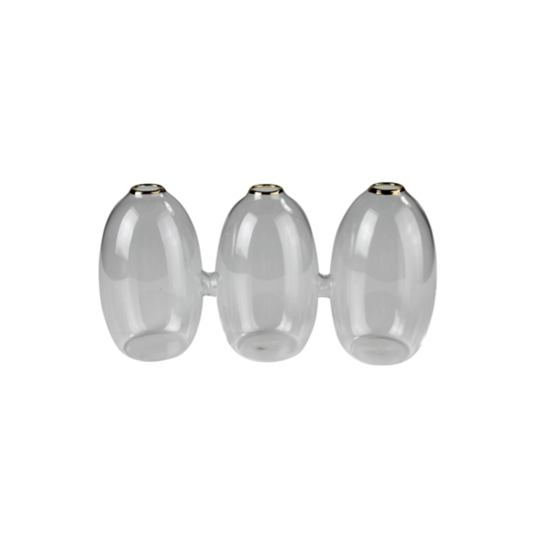 A trio of joined glass vases with an accentuated gold rim comes together as an instant arrangement for single stems and floral cuttings.