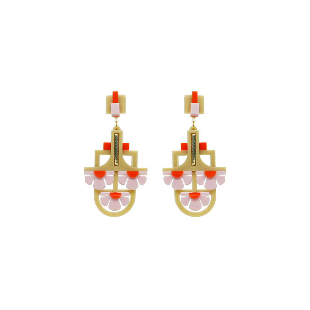 Acrylic earring, pendant model. Metals with a gold finish. Handmade by Brazilian artisans.