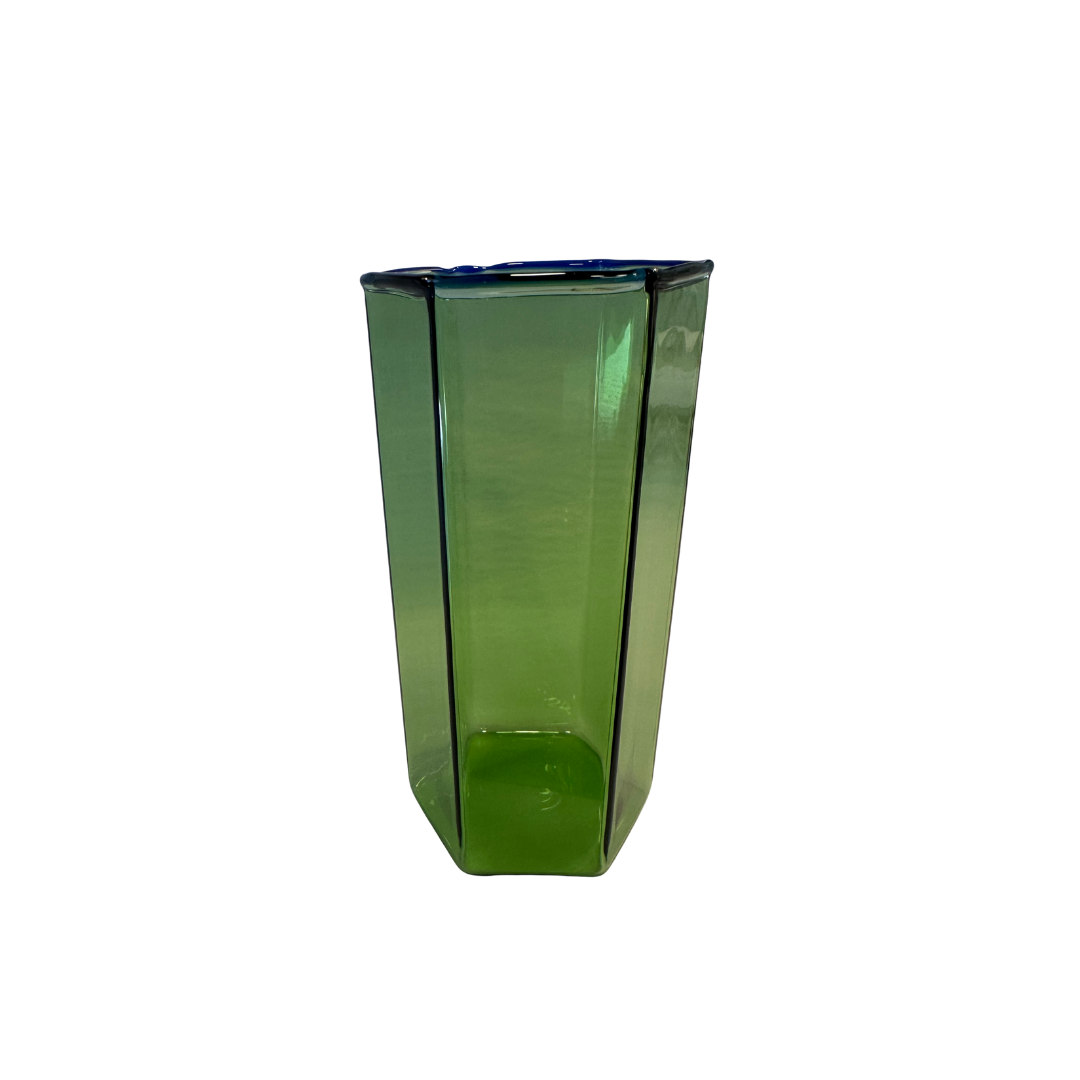This tall hexagonal vase combines elegant design with versatile functionality. Crafted in a deep green hue with a contrasting blue rim, it adds a sophisticated touch to any space. Its geometric shape enhances visual interest, while its sturdy build allows it to double as a highball glass, making it both decorative and practical for a variety of uses. Ideal for showcasing flowers or serving drinks with style.