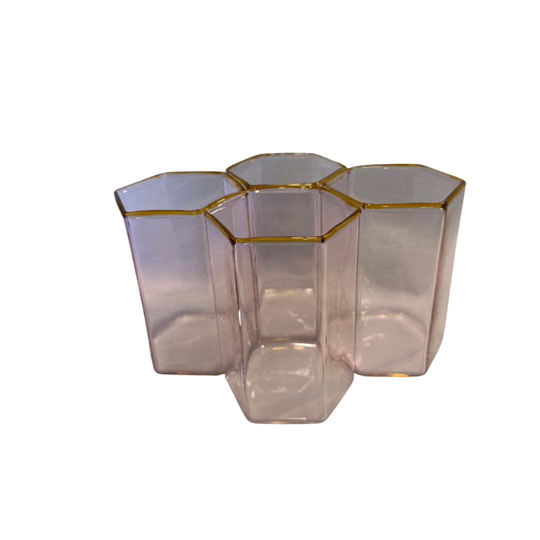 This Small Hexagon Vase in pink glass with an amber rim showcases expert craftsmanship with its handmade quality. Its unique geometric shape and vibrant colors make it a versatile piece—ideal as a small vase or an elegant lowball glass. Perfect for adding a touch of refined color and form to any setting.