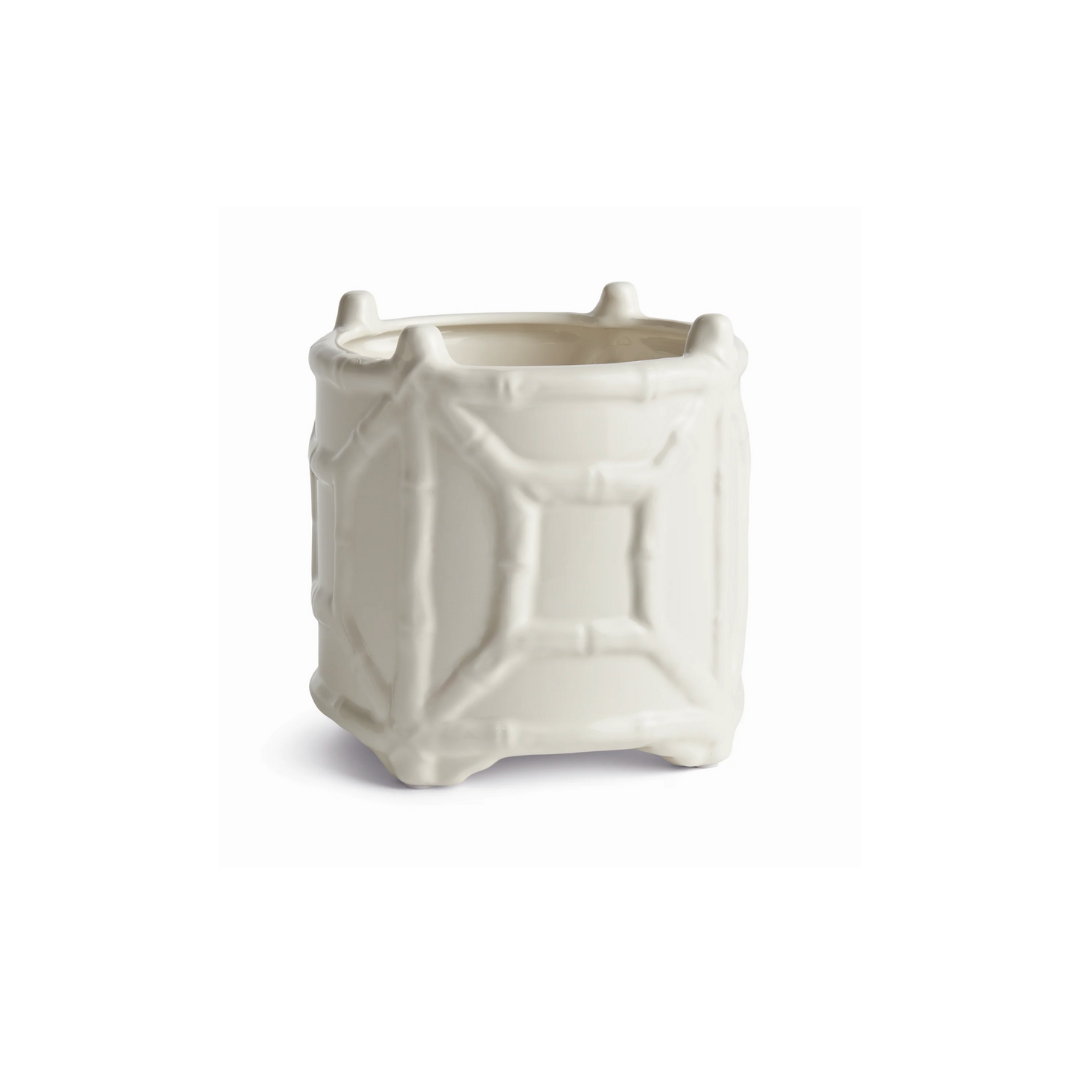 This clean, white cachepot is made in classic style. With unmistakable chinoiserie-inspired bamboo details with a rounded shape, it adds charm to any space. Does not have drain hole.