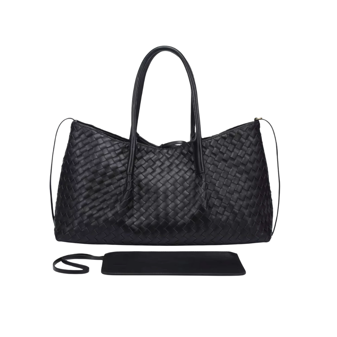 This large woven tote bag in black combines spaciousness with practical design. Crafted for durability, it features a secure tie closure to keep your belongings safe and comes with a matching pouch for organizing smaller items. Ideal for everyday use or travel, it offers both style and functionality.