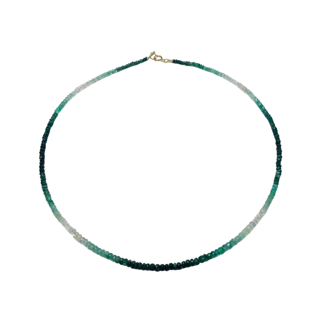 sparkly shaded emerald green heishi cut necklace with 14kt gold clasp, 16 inches in length