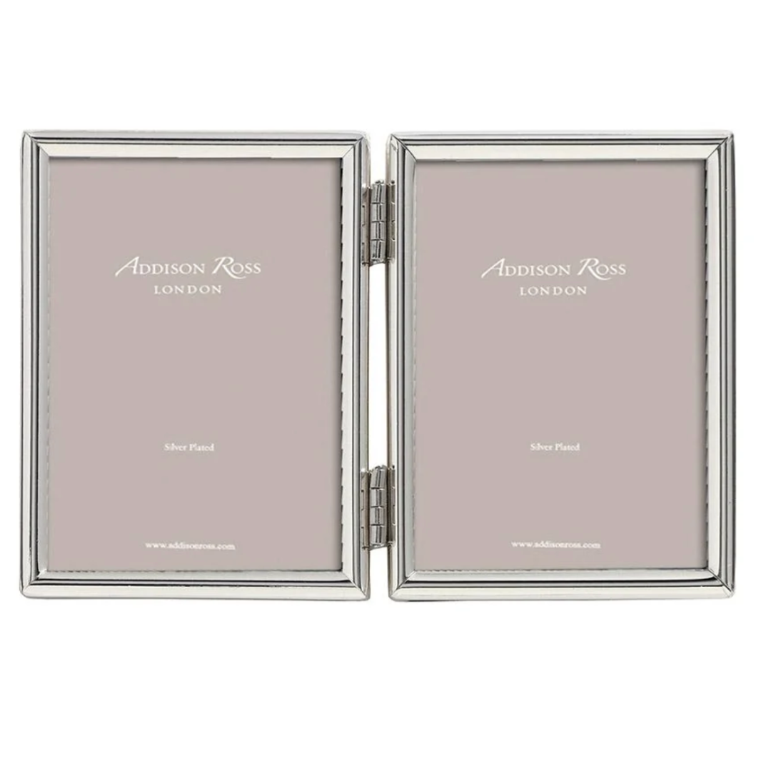 Simple and elegant, this fine edged, silver plated double photo frame is a simple but stylish addition to any room. Two small hinges between each frame allow the piece to stand freely on your bookshelf, side table, or desk.