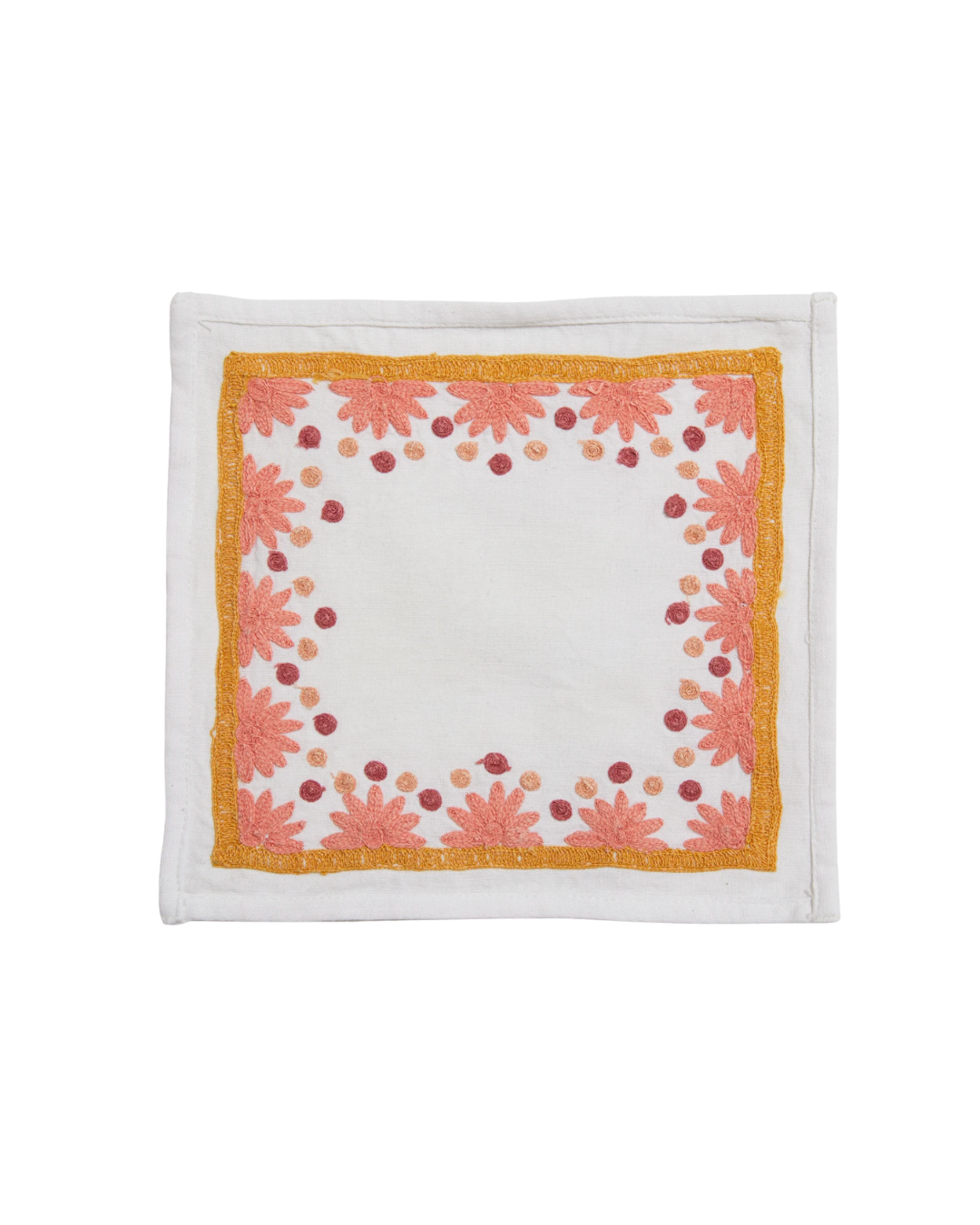 Our Starburst design is created using an artisanal chain stitch embroidery technique. This embroidery resembles the techniques used to create original Suzani textiles. Colorful and sophisticated, our Starburst cocktail napkin add a punch of color to any summer table.