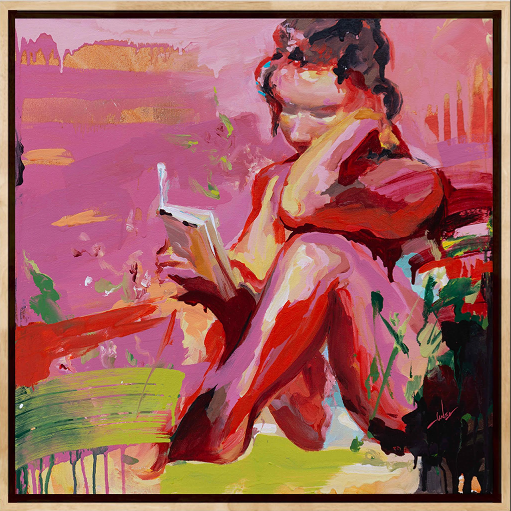 24x24 Acrylic on Canvas. Framed in natural maple floater.