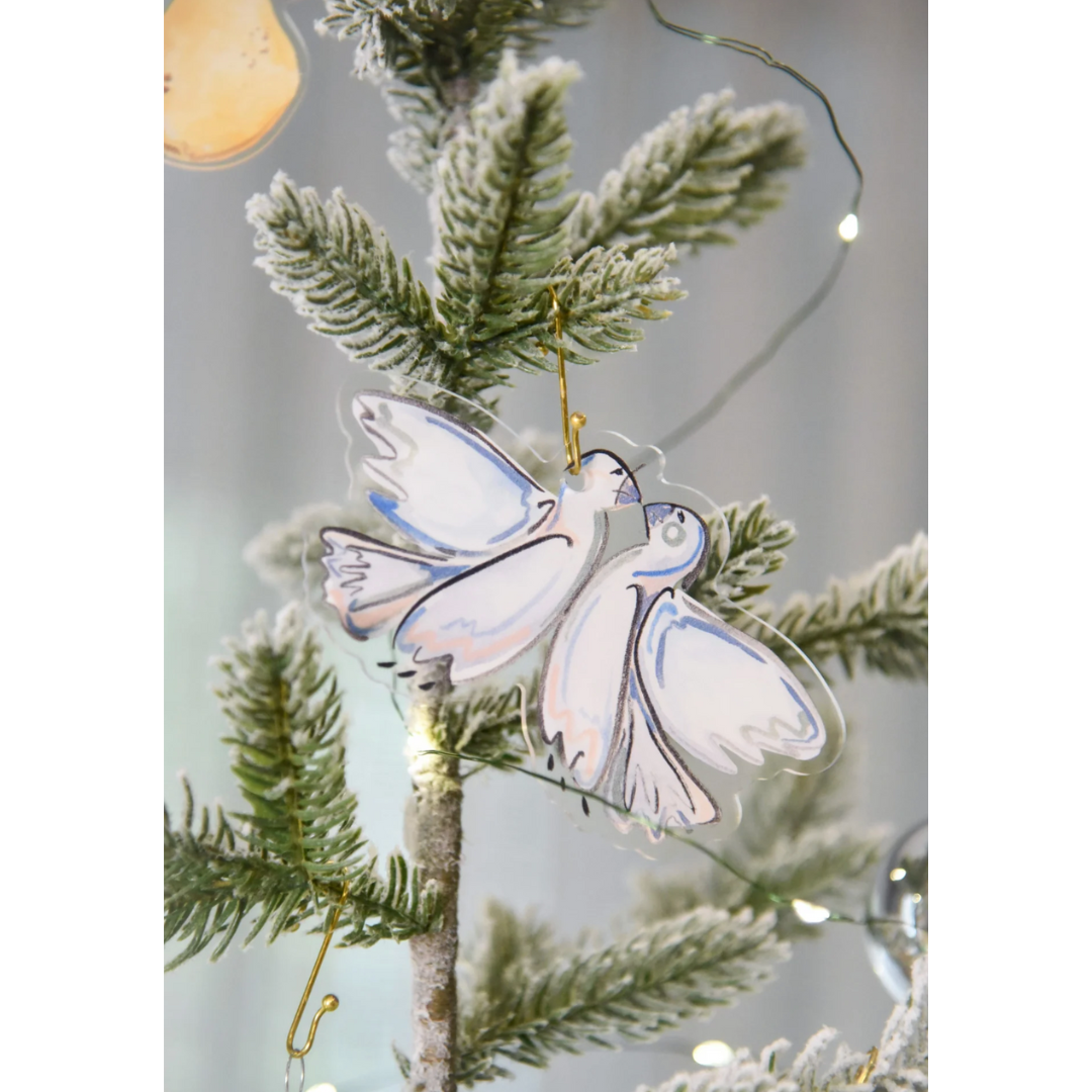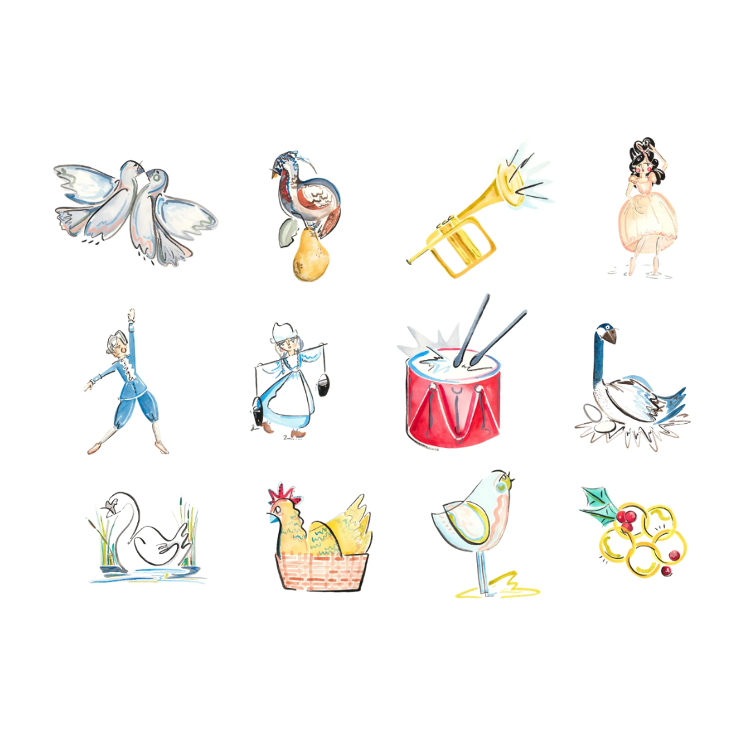 The Twelve Days of Christmas Acrylic Ornaments feature unique watercolor renderings of the twelve days of Christmas. Jessica O'Neill's unique spin on the age-old carol, "Twelve Days of Christmas" is printed on twelve acrylic ornaments with gold hooks. These festive ornaments are beautiful displayed on traditional trees and our Clear Acrylic Tree.