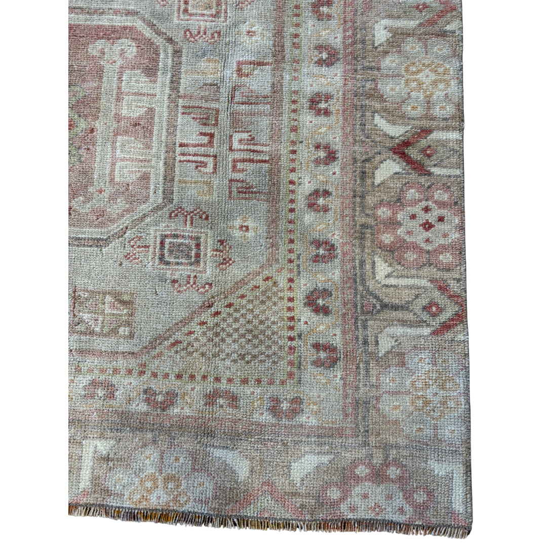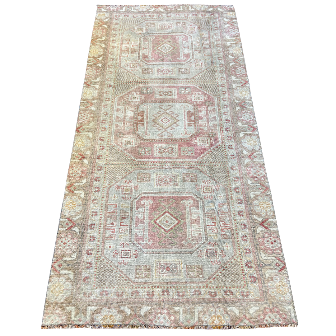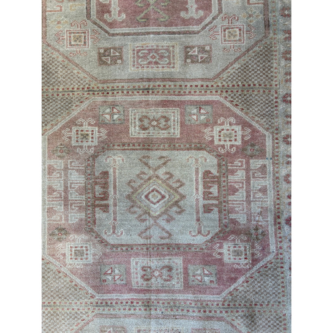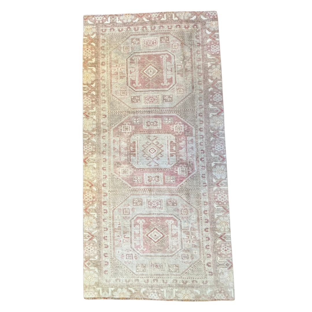 Vintage Rug with soft hues of pink, measuring 7'2"x3'8".