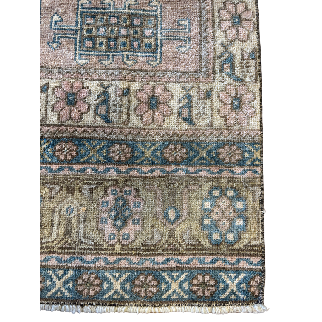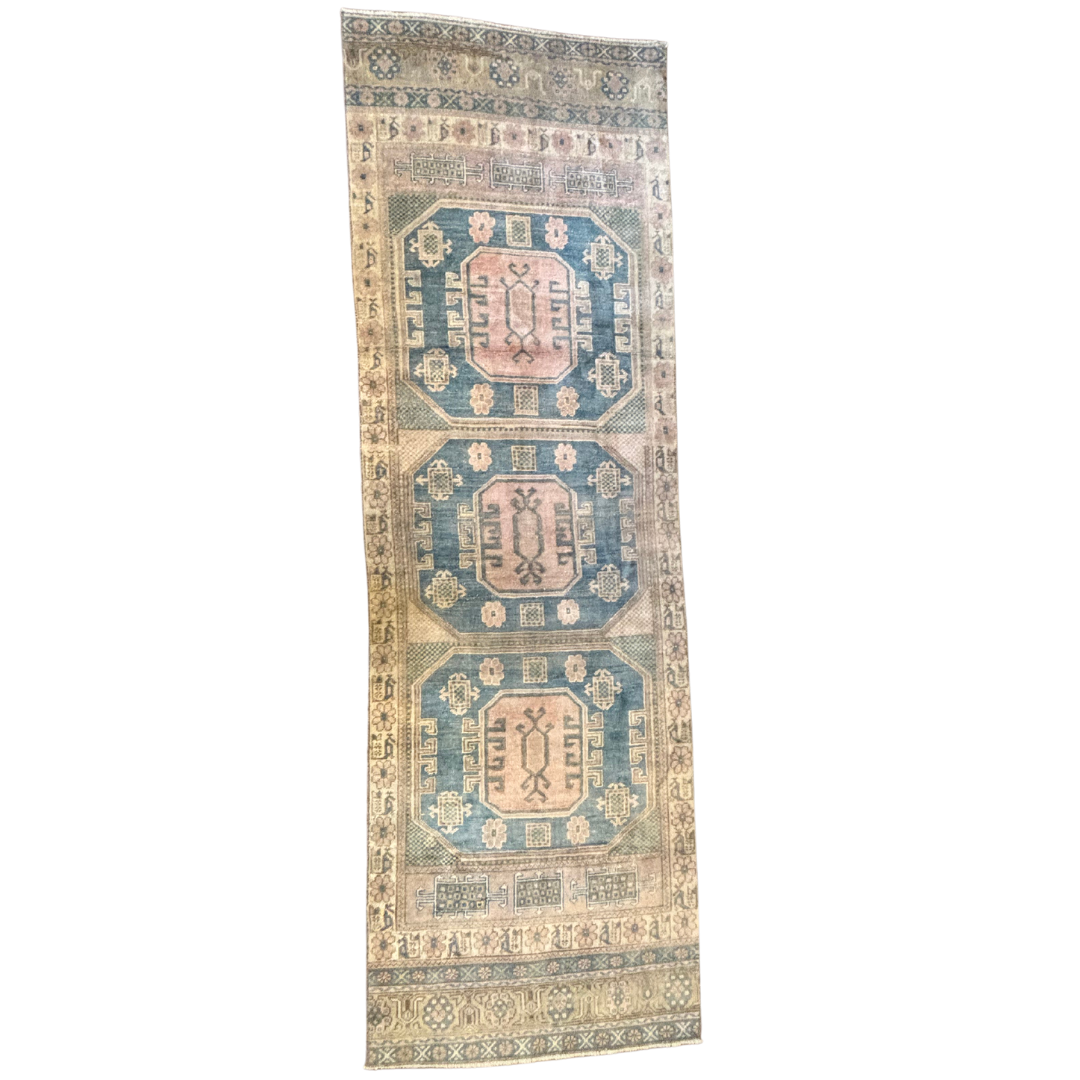Vintage runner with hues of blue and pink, measuring 9'10"x3'2".