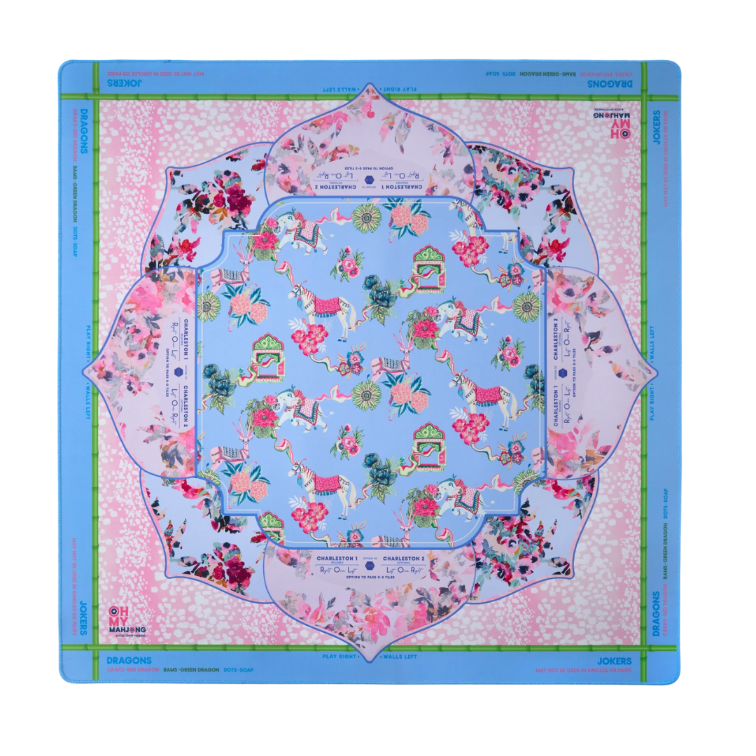 Introducing the Vivara Mat — a vibrant and whimsical celebration of pattern and play, designed for the Mahjong enthusiast who loves bold beauty with a worldly twist. Featuring a charming mix of elephants, blooming florals, and painterly antelope print in shades of soft pinks and layered blues, this mat brings an elevated sense of joy and wanderlust to your game night aesthetic. It’s artful yet playful — a visual escape that feels part garden fête, part global adventure.